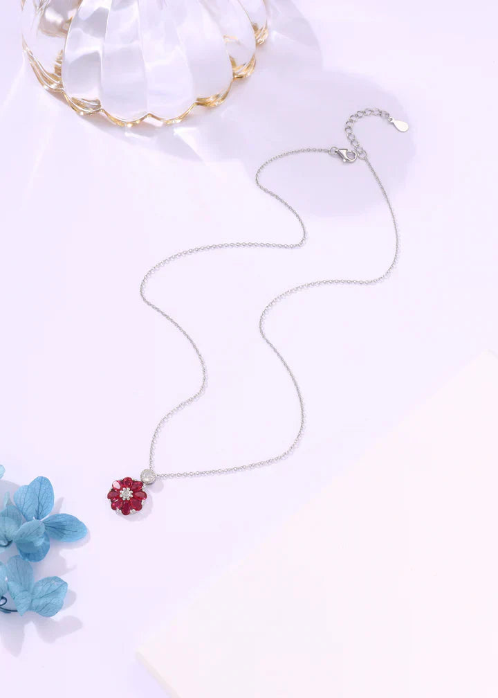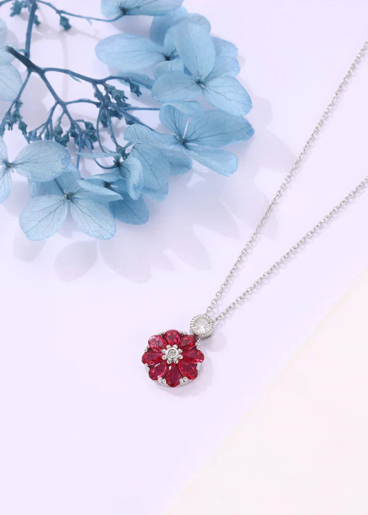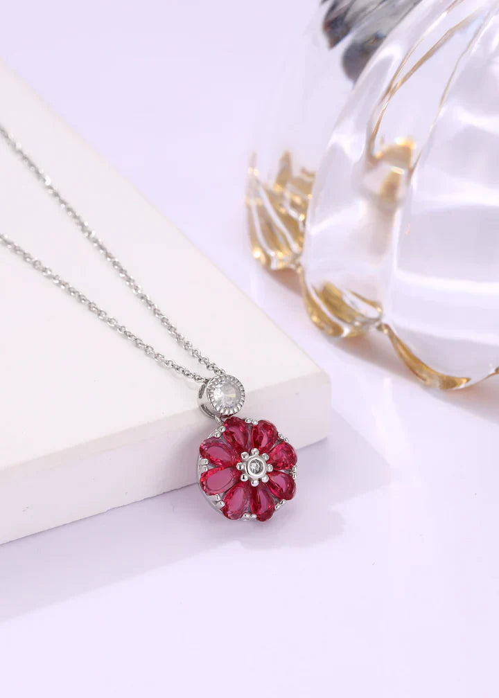 Enhance your elegance with our sterling silver chain, featuring a circular pendant adorned with pink stones arranged in a delicate flower shape. This charming piece adds a touch of floral beauty and sophistication to any outfit, making it perfect for both everyday wear and special occasions.