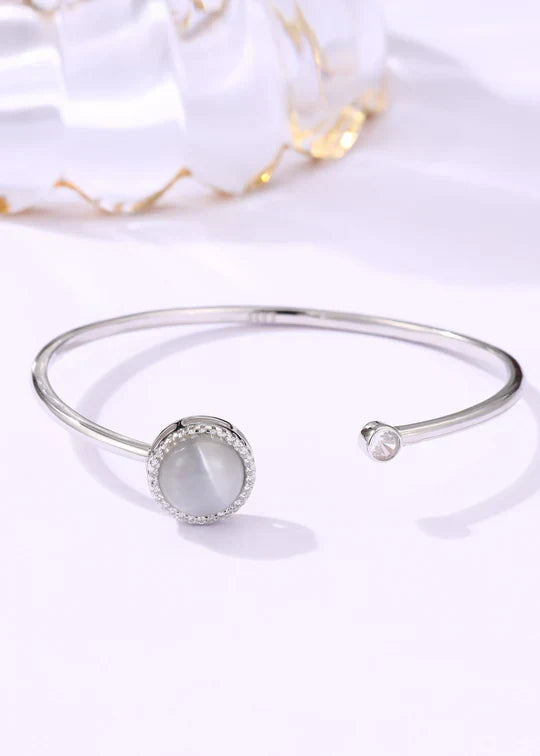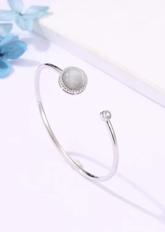 Experience the allure of our sterling silver kada bracelet featuring a mesmerizing rotating moonstone. This unique piece combines elegance and functionality, making it a standout addition to any jewelry collection.